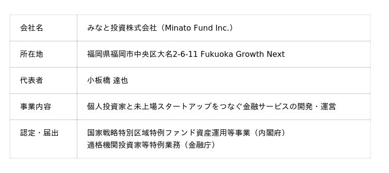 「ベンチャー投資を、もっと身近に。」をビジョンに掲げるみなと投資株式会社(本社:福岡県福岡市、代表取締役:小板橋達也)は、個人投資家がVCファンドに直接出資できる新たな投資チャネルとして、個人向けマイクロVC「みなとファンド」をリリースし、1号ファンドの組成・運用を開始したことをお知らせします。