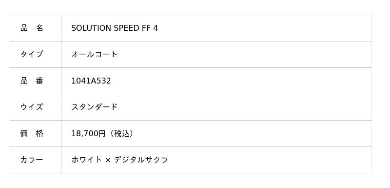 スピードと俊敏性を求めるプレーヤー向けのテニスシューズ「SOLUTION SPEED FF 4」を着用します。トッププレーヤーの意見を取り入れて開発したテニスシューズです。