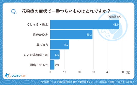 最もつらい症状は「くしゃみ・鼻水」(48.0%)が突出し、「目のかゆみ」(29.3%)が続きました。「鼻づまり」(13.2%)も一定割合を占め、「のどの違和感・咳」(6.5%)、「頭痛・だるさ」(2.9%)は相対的に低い結果となっています。