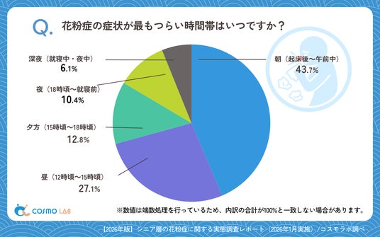 最もつらい時間帯は「朝(起床後~午前中)」(43.7%)が最多で、「昼(12時頃~15時頃)」(27.1%)が続きました。「夕方(15時頃~18時頃)」(12.8%)、「夜(18時頃~就寝前)」(10.4%)、「深夜(就寝中・夜中)」(6.1%)は相対的に低い結果となっています。