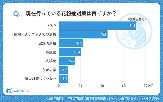 現在行っている対策では、「マスク」(71.3%)が突出しており、基本的な防御策として広く定着していることがうかがえます。「病院・クリニックでの治療」(45.0%)も高く、医療的な対処を選択する層が一定数いることが確認されました。