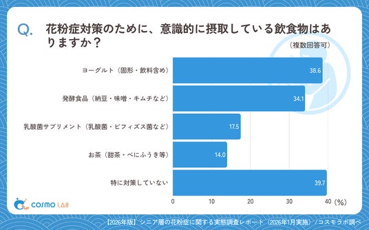 シニア専門のマーケティングプラットホーム コスモラボ(会社名:コスモヘルス株式会社、本社:東京都港区、代表取締役社長 小塚 崇史)がシニア層の『食の楽しみ方』に関するアンケートリサーチのレポートをリリースしました。本レポートでは、50歳以上のシニア層を対象に、花粉症における症状の有無、つらさを感じる時間帯や日常生活への影響をはじめ、現在行っている対策や困りごとを分析しました。調査結果から、対策の実態とハードルを可視化し、今後の支援策に向けた見解をお届けします。