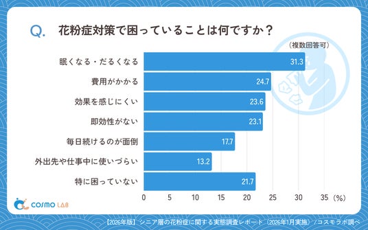 現在行っている対策は「マスク」(71.3%)が突出し、「病院・クリニックでの治療」(45.0%)と続きました。一方、困りごとでは「眠くなる・だるくなる」(31.3%)が最多で、対策の継続性と副作用の折り合いが課題であることが浮き彫りとなりました。