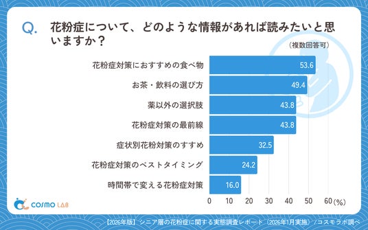 情報ニーズでは「花粉症対策におすすめの食べ物」(53.6%)や「お茶・飲料の選び方」(49.4%)が上位となり、日常生活に取り入れやすい対策への関心の高さがうかがえます。