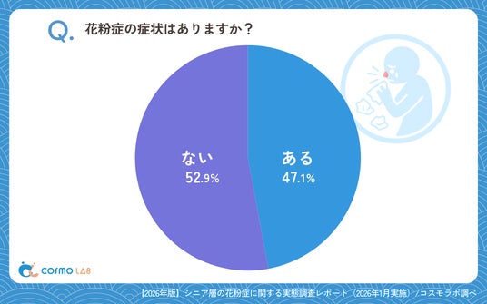 本調査では、花粉症の症状は「ない」(52.9%)が「ある」(47.1%)をやや上回るものの、差は小さく、当事者と非当事者がほぼ半々であることが分かりました。