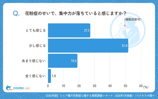 集中力低下は「少し感じる」(51.8%)が最多で、「とても感じる」(27.3%)も一定割合を占め、仕事・家事の効率低下(41.9%)や外出控え(31.1%)、睡眠不足(28.9%)など、生活全体への影響も確認されました。