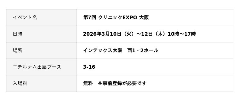 『永遠の美しさへの夢が、夢に終わらない未来を創りあげること』を使命に掲げる株式会社エテルナム(東京都渋谷区、代表取締役:松本隆明)は、2026年3月10日(火)から12日(木)まで、インテックス大阪にて開催される西日本最大級のクリニック向け製品・サービス展示会「第7回クリニックEXPO大阪」に出展いたします。