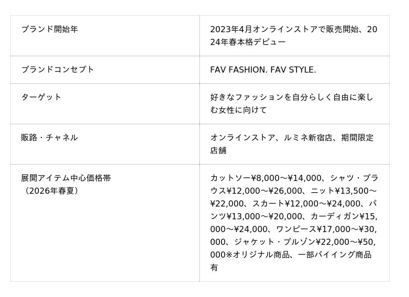 “FAV FASHION. FAV STYLE”をコンセプトに、好きなファッションを自分らしく自由に楽しむすべての女性たちへ向けて、枠にとらわれないスタイルを提案します。
