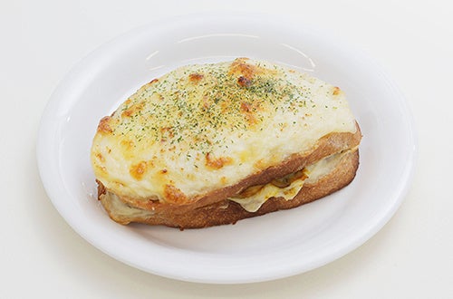 中にはベビーホタテとマッシュルーム。コクのあるチーズソースで仕上げたフルニエさん秘伝のクロックムッシュ。
