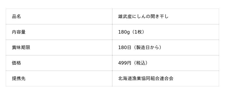 大ぶりの雄武産にしんを開き干しにしました。頭と内臓を取り除き、開いて塩水加工したあと、冷風で乾燥させています。この地域で獲れるにしんは脂肪分が多く、コクと旨みがあります。塩水に漬け、冷風をあててやわらかめに干すことで、まろやかに仕上げています。焼き過ぎないよう、脂が落ちてきたら食べ頃です。ふっくらとして、ほろっとほぐれる身はご飯がすすみます。