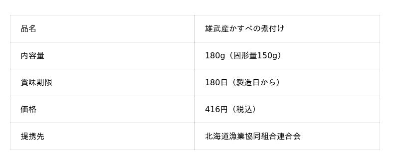 かすべ(えい)のえんがわ付近を煮付けた北海道の郷土料理です。雄武産のかすべを水揚げ後、鮮度のよい状態で加工しました。産地周辺以外ではなじみのない魚ですが、コラーゲンが豊富で、ぷるぷるとして口あたりはなめらか。コリコリした軟骨ごと食べられる、食感もたのしい唯一無二の味わいです。電子レンジであたためるだけで、手軽に食べられます。