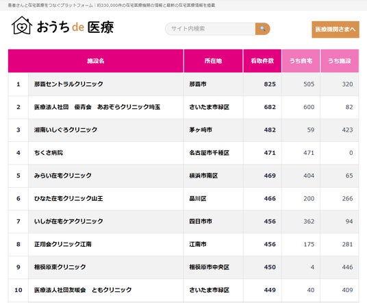 ランキングは、全国の在宅療養支援診療所・病院が厚生局へ提出した報告書(様式11の3)をもとに、2024年8月から2025年7月までの在宅看取り件数を集計したもの。