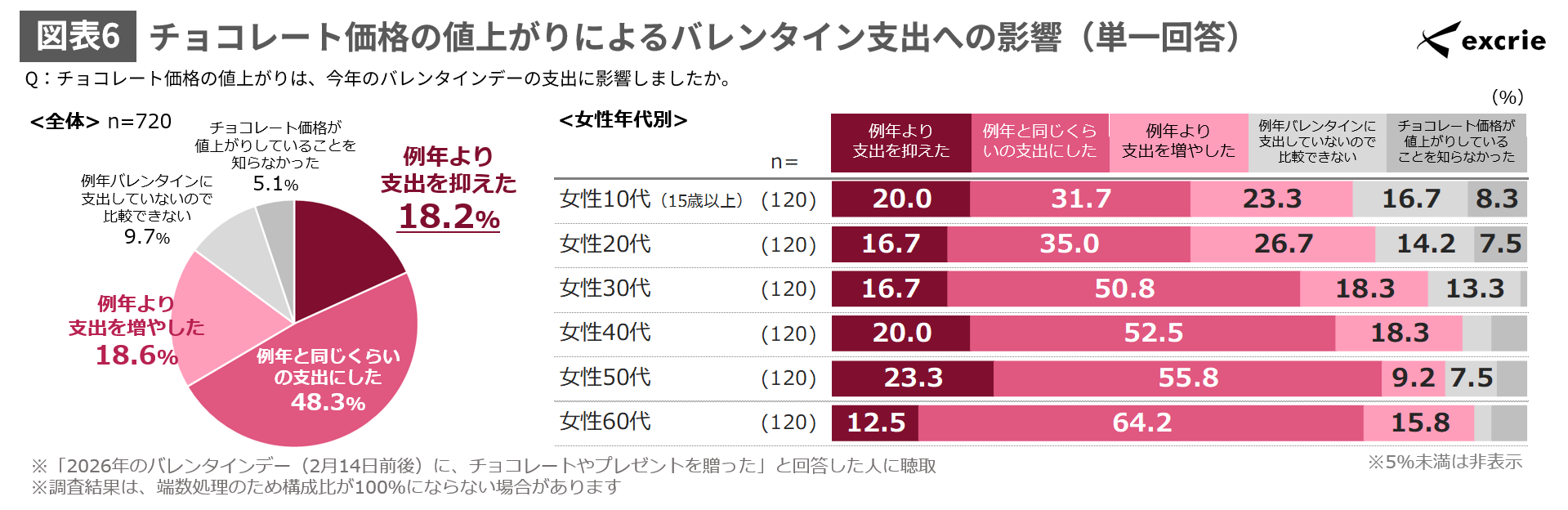 チョコレート価格の値上がりによるバレンタイン支出への影響を聴取したところ、「例年より支出を抑えた」が18.2%、「例年と同じくらいの支出にした」が48.3%、「例年より支出を増やした」が18.6%となりました。50代は「例年より支出を抑えた」の割合が他セグメントより高くなっています。(図表6)