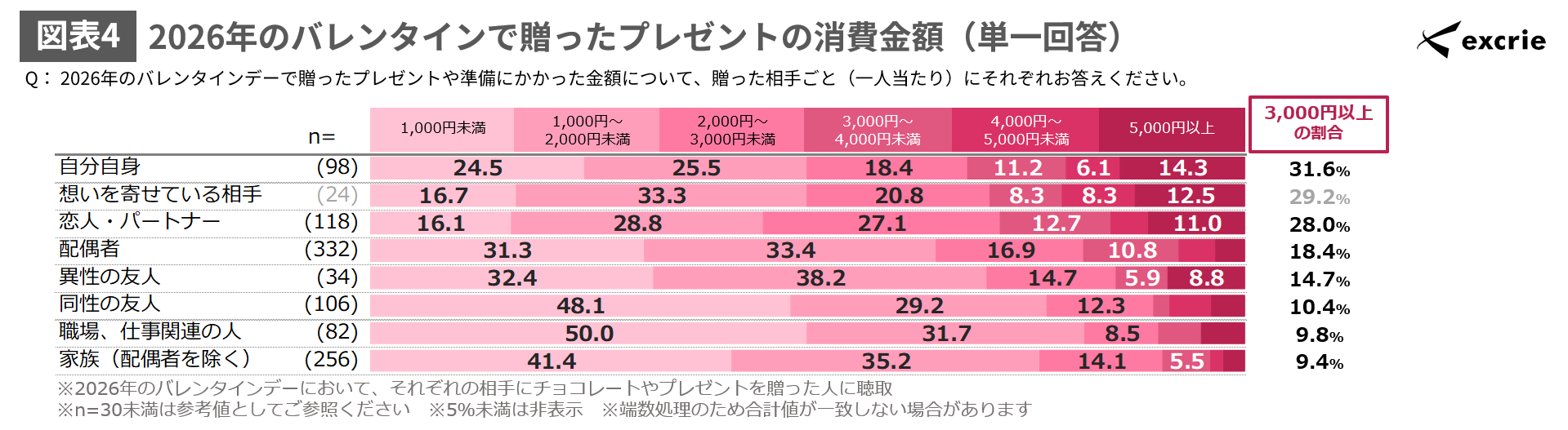 2026年のバレンタインで贈ったプレゼントの消費金額(一人当たり)を贈った相手別に聴取したところ、3,000円以上の割合は、自分自身が31.6%と最も高くなりました。また、恋人・パートナーは28.0%と3,000円以上の割合が比較的高くなっています。一方、同性の友人や職場・仕事関連の人、家族(配偶者を除く)は1,000円未満の割合が比較的高くなりました。(図表4)
