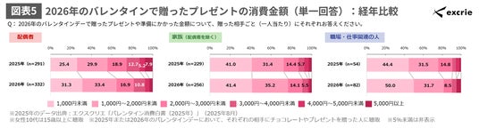 2025年のバレンタインにおける消費金額と比較したところ、配偶者、家族、職場・仕事関連の人に贈ったプレゼントの消費金額について2,000円未満の割合が微増しています。(図表5)