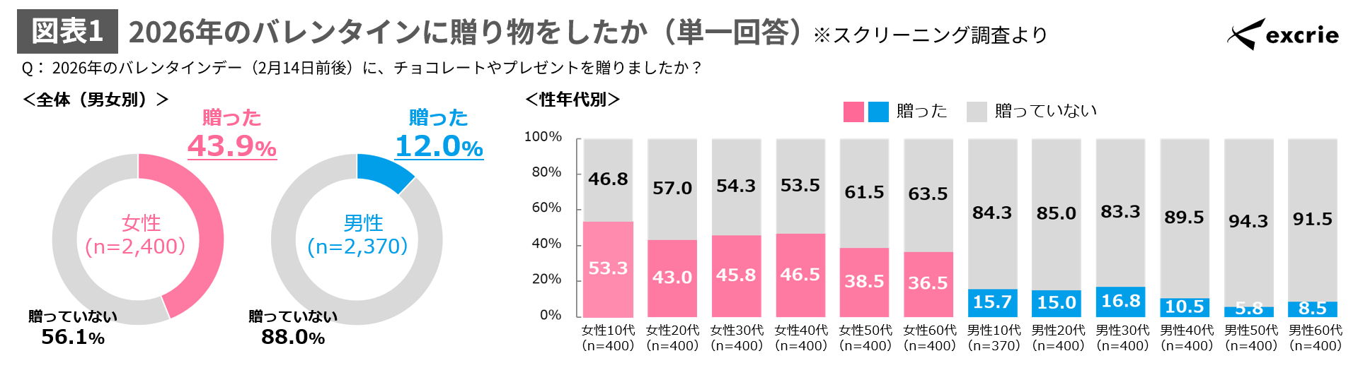 株式会社クロス・マーケティンググループのグループ会社でソーシャル&セールスプロモーションサービスを展開する株式会社エクスクリエ(本社:東京都新宿区、代表取締役社長:小笠原 亨)は、全国15歳~69歳男女(956人)を対象に「2026年バレンタインにおける消費実態調査」をWebアンケートにて2026年2月20日(金)~24日(火)に実施しました。