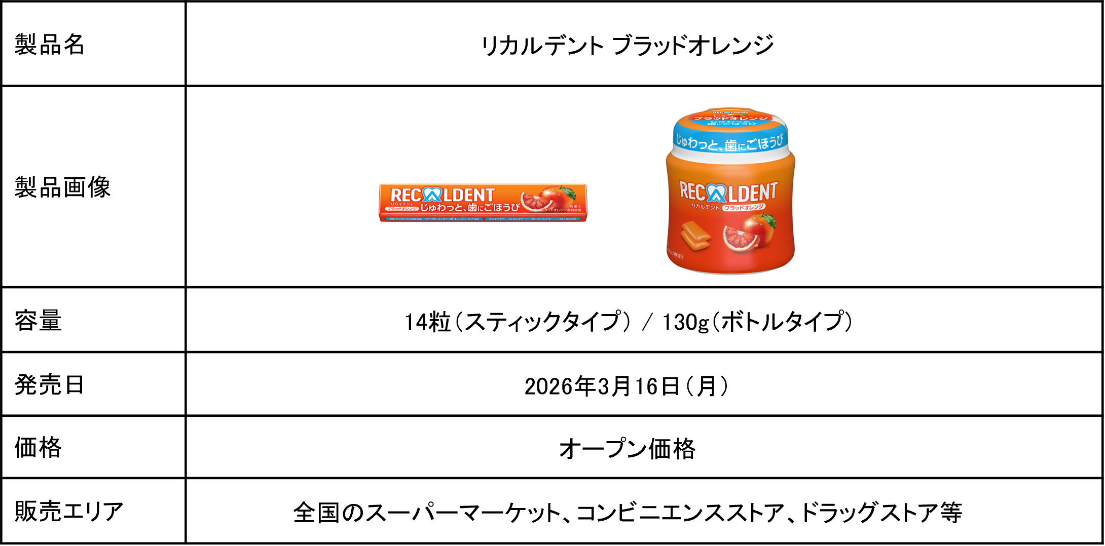 モンデリーズ・ジャパン株式会社(本社:東京都品川区 / 代表取締役社長:碇祐輔)は、独自の牛乳由来成分「CPP-ACP」を配合した『リカルデント』ブランドから、爽やかな酸味と程よい甘さで、大人から子どもまでお楽しみいただける新フレーバー「リカルデント ブラッドオレンジ」を、2026年3月16日(月)より全国小売店にて発売いたします。「CPP-ACP」とキシリトール配合で歯を大切にしながら、爽やかなフルーツの風味をお楽しみいただける商品となっております。
