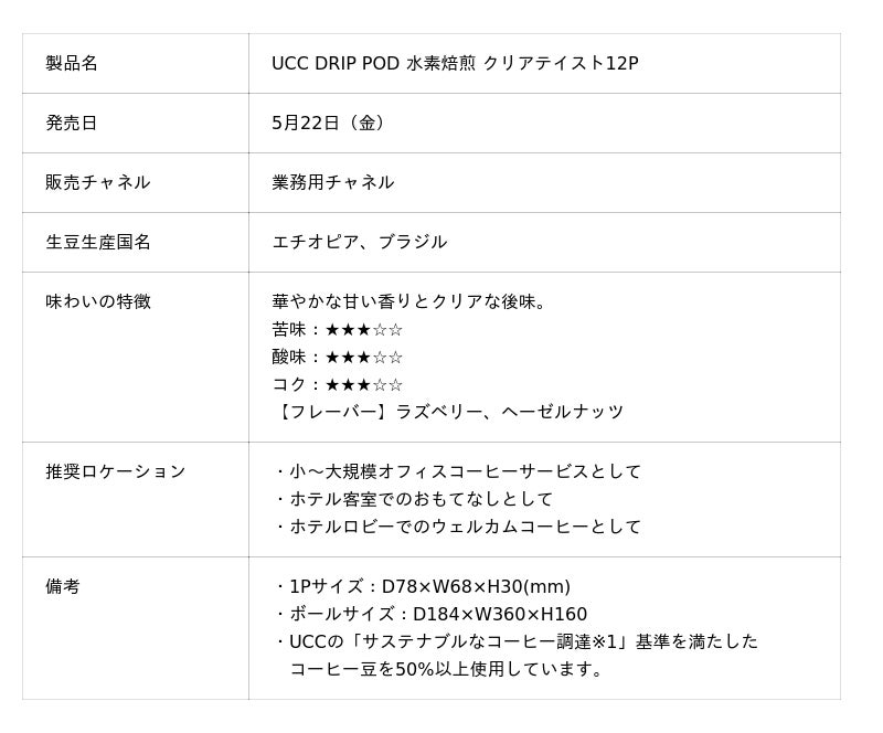 UCC上島珈琲株式会社(本社/兵庫県神戸市、資本金/1億円、社長/芝谷博司、以下UCC)が提供するカプセル式ドリップコーヒーシステム「ドリップポッド」は、燃焼時にCO2を排出しない水素火炎を熱源とする水素焙煎技術を使用したカプセル『水素焙煎 クリアテイスト12P』を5月22日(金)に発売します。オフィスコーヒーサービスや、ホテルの客室・ロビーでのウェルカムコーヒーなどのロケーション利用をご提案することで、ご家庭以外でも“おいしい、しかも環境にいい。”水素焙煎コーヒーに触れていただく機会をご提供いたします。なお、ドリップポッドブランドとして、業務用において水素焙煎技術を使用したカプセルの発売は初めてです。