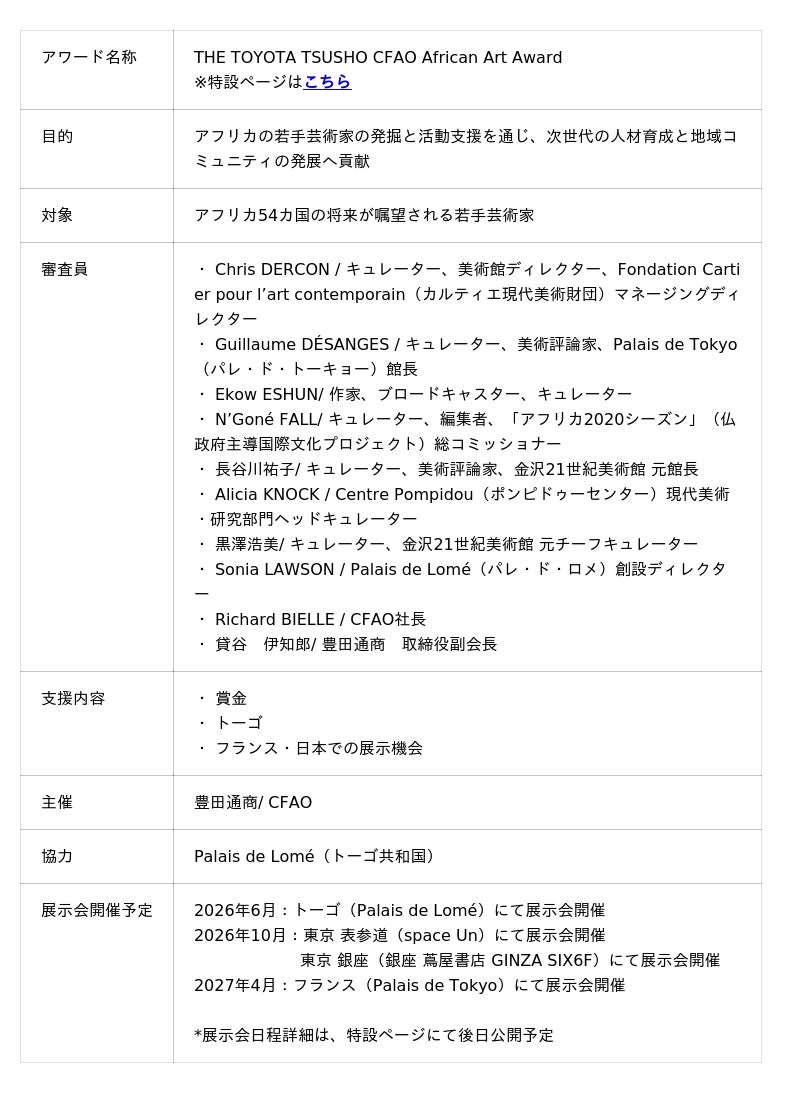 - 2025年8月18日発表:アフリカの未来を芸術とともに創造する文化・芸術振興活動THE TOYOTA TSUSHO CFAO African Art Awardを開始