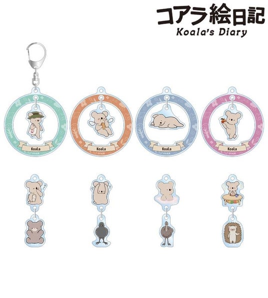 コアラさん、くまちゃん、カラスさん、エミューさん、ハリネズミさんのイラストをゆらゆら動くアクリルキーホルダーに仕上げました。