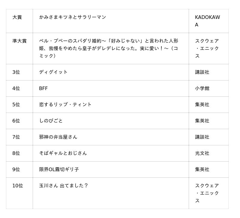 三洋堂書店は1959年に名古屋で創業後、当初の書籍雑誌の取扱いに始まり、これまで様々な商材やサービスの導入を行ってまいりました。創業60周年を迎えた2019年に記念企画の一つとして開催した三洋堂書店独自のコミックアワード「#でらコミ! でらおもしろいイチオシコミックはこれだがね!」(以下「#でらコミ!大賞」)は、その後回数を重ね、この度、7度目の「#でらコミ!大賞」を開催し、三洋堂書店のスタッフとお客様での投票の結果、第7回の大賞受賞作品は『かみさまキツネとサラリーマン』(著:ヤシン 刊行:KADOKAWA)、準大賞に『ベル・プペーのスパダリ婚約~「好みじゃない」と言われた人形姫、我慢をやめたら皇子がデレデレになった。実に愛い!~(コミック)』(原作:朝霧あさき 原作イラスト・漫画:セレン 刊行:スクウェア・エニックス)が選ばれました。