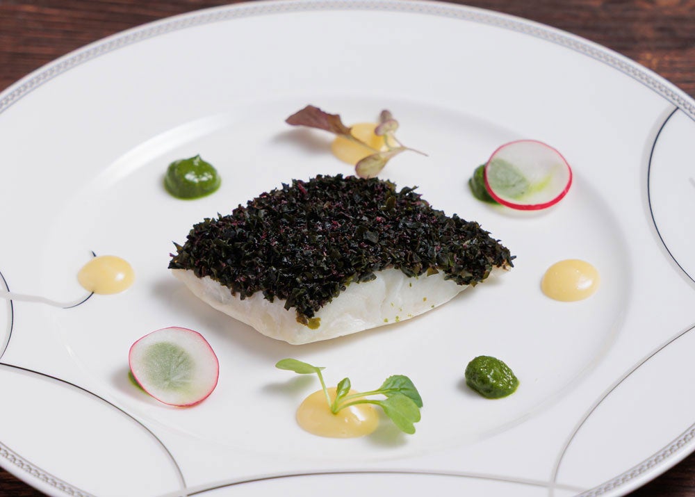 ほんのりとした磯の香りと梅の爽やかさに、レモンを使用したソース〈クーリー・ド・シトロン〉を合わせ、軽やかな味わいに仕上げています。