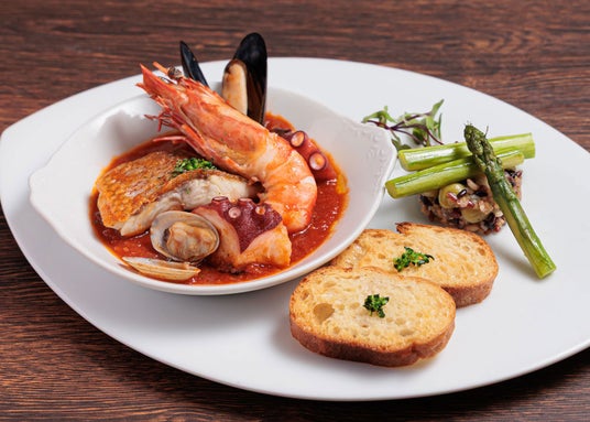 有頭海老と魚介の赤ワイン仕立て リヴォルネーゼ風有頭海老をはじめとした魚介を、赤ワインとトマトソースでじっくりと煮込みました。