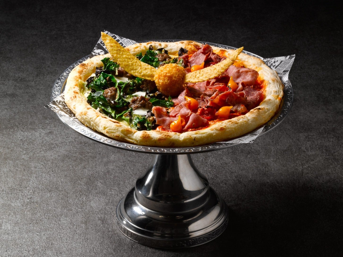 ハリーのクィディッチデビュー戦である、グリフィンドールVSスリザリンをハーフ&ハーフのピザにする事で対戦を表現。
