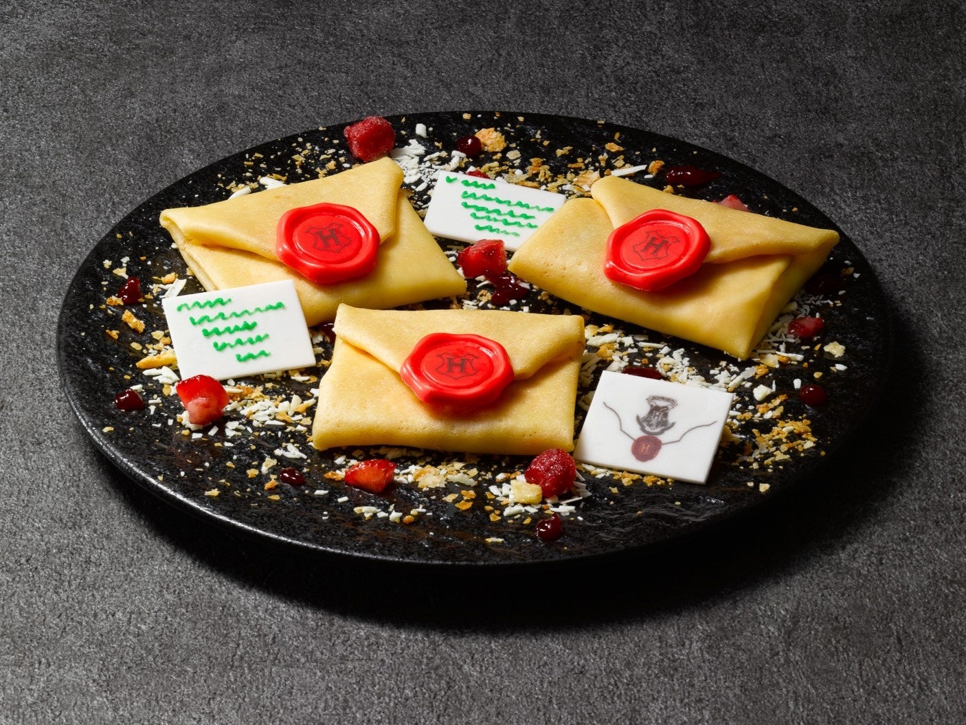 苺ミルク・チョコバナナ・ティラミスの3種のレタークレープで、ハリーに届いた大量の入学許可証を表現しました。