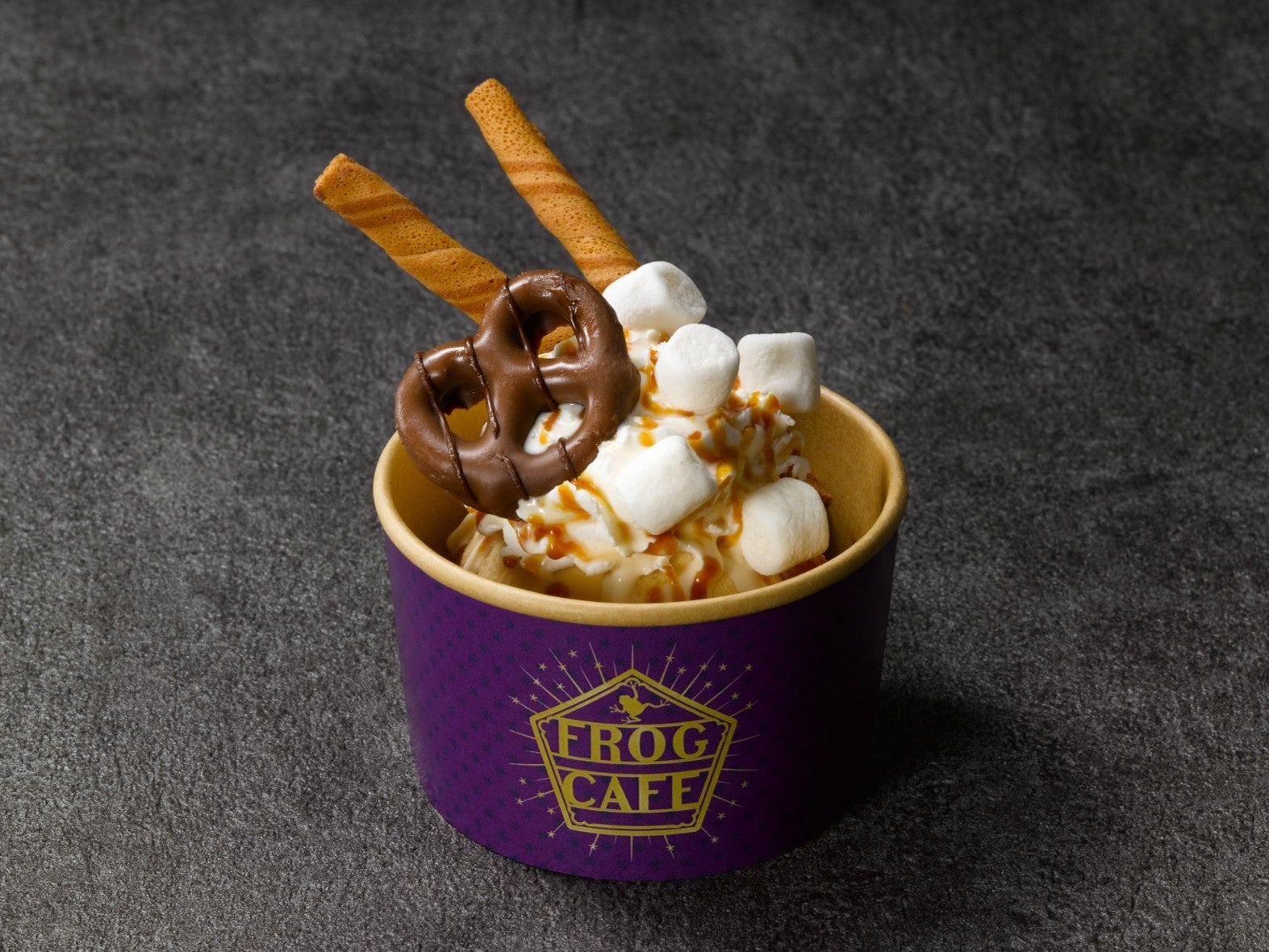 魔法界で大人気のバタービールがミニサンデーになって新登場。下に敷き詰められたパイのザクザク食感とキャラメル味のアイスクリームの相性をお楽しみください。