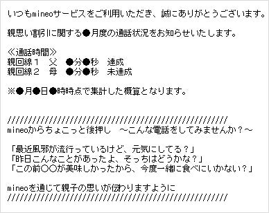 通話時間が10分未満の場合には、mineoから通話状況お知らせメールをお届けします。親御さまへの連絡を思い出すきっかけをつくり、定期的な通話を自然に後押します。