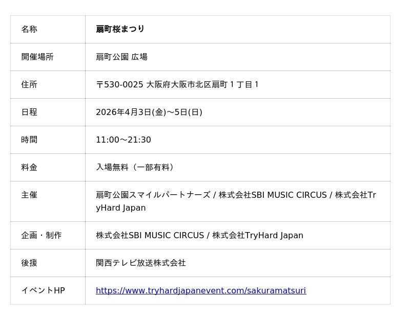 株式会社SBI MUSIC CIRCUS(本社:東京都港区、代表取締役社長:大付 楽洋、以下「当社」)は、扇町公園スマイルパートナーズとともに関西テレビ放送株式会社の後援を受け、2026年4月3日(金)から4月5日(日)の3日間、扇町公園にて「扇町桜まつり」を開催いたします。