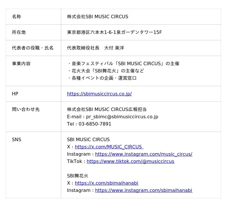 株式会社SBI MUSIC CIRCUSは、「エンタテインメントの力で、世界一笑顔を届ける」をミッションに掲げ、国内最大級の音楽フェスティバル「SBI MUSIC CIRCUS」や、関西最大級の花火大会「SBI舞花火」などを手掛けています。