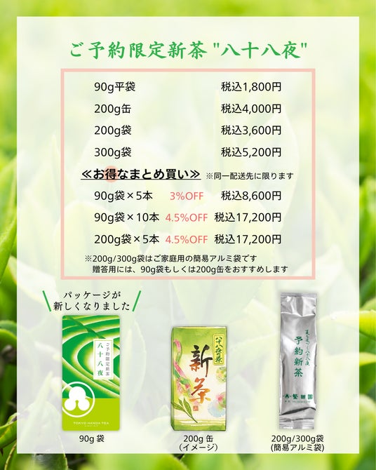 東京繁田園茶舗・創業以来の人気商品である「ご予約限定新茶 八十八夜」のご予約受付を開始しました。今年は、新た90gデザイン平袋が登場。多様化するニーズに応え、新茶の美味しさを多くの人々に届けます。