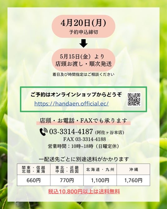 日本茶小売および卸売業を営む株式会社東京繁田園茶舗(本店:東京都杉並区、代表:繁田穣)は、3月6日(金)より店頭およびオンラインショップにて、創業以来の人気商品である「ご予約限定新茶 八十八夜」のご予約受付を開始しました。