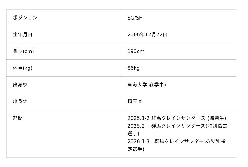 「特別指定選手としてプレーさせていただいた期間、素晴らしい環境の中で多くの経験をさせていただきました。チームメイト、コーチ陣、スタッフの皆さま、そしてどんな時も温かく応援してくださったファンの皆さまには、心から感謝しています。昨年、今年と群馬クレインサンダーズとしてプレーできたことは、僕にとって本当に貴重な経験であり、大きな財産になりました。