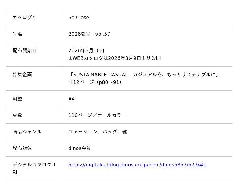 株式会社dinos(本社:東京都中野区、代表取締役社長:加藤 浩輔)は、“自分らしさ”を大切にするこだわりの上品カジュアルスタイルを提案するファッションブランド『So Close,(ソークロース,)』2026夏号において、サステナブルな素材を使ったアイテムの特集企画を掲載し、2026年3月10日に発刊します。また、ディノスオンラインショップにおいて特集企画ページに掲載している各商品を販売いたします。