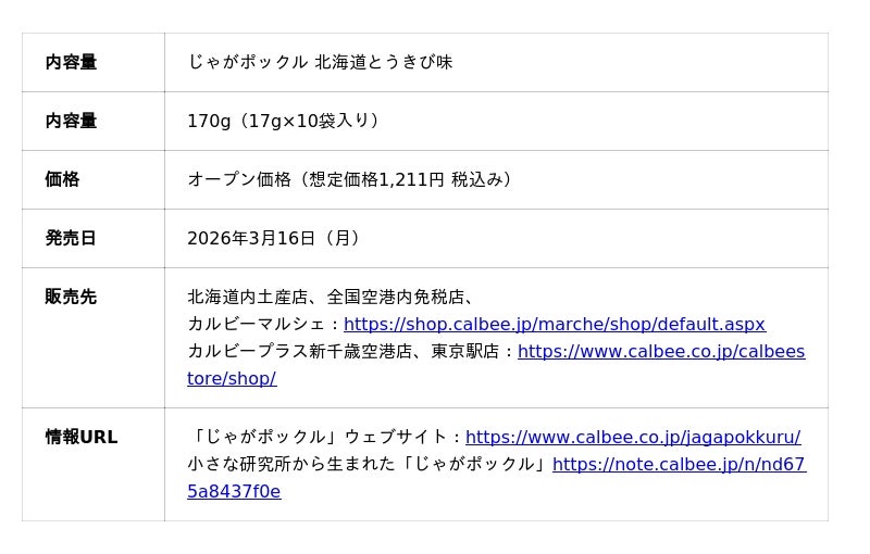 カルビー株式会社(本社:東京都千代田区、代表取締役社長兼CEO:江原 信)は、北海道土産のロングセラー商品「じゃがポックル」より、北海道産とうもろこしパウダーを使用した『じゃがポックル 北海道とうきび味』を2026年3月16日(月)から北海道内土産店、全国空港内免税店、およびカルビープラス新千歳空港店、東京駅店にて発売します。
