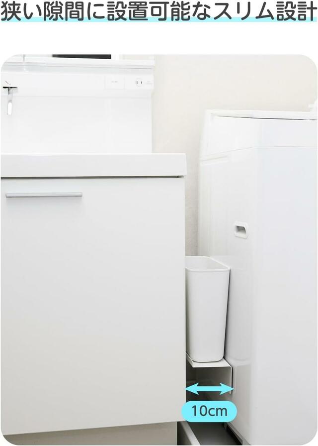 最大の特長は、わずか約10cmの隙間に設置できるスリム設計。洗濯機と壁の間など、これまで使いにくかったデッドスペースを収納に変えられます。