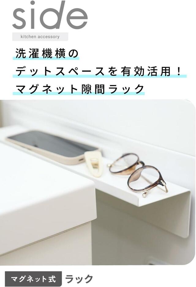 洗濯機と壁のあいだにある、微妙なデッドスペース。ELECOM(エレコム)の「“side”洗面所アクセサリー マグネット式 洗濯機横隙間ラック KAWWSLSMWH」は、わずか約10cmの隙間に設置できる超スリム設計で収納をちょい足しできるアイテムです。