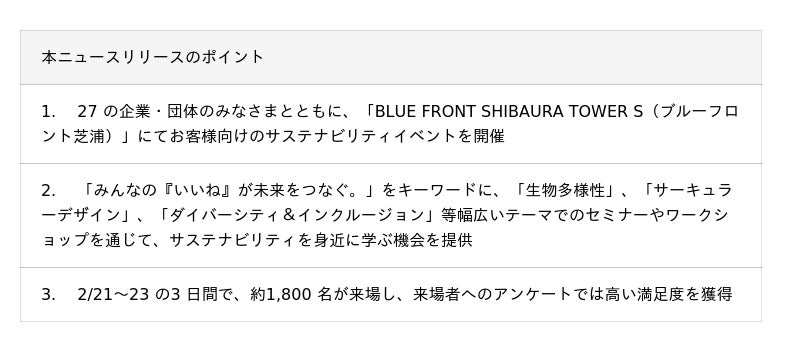 野村不動産ホールディングス株式会社(本社:東京都港区/代表取締役社長:新井 聡、以下「野村不動産ホールディングス」)、野村不動産株式会社(本社:東京都港区/代表取締役社長:松尾大作、以下「野村不動産」)は、2026 年2 月21 日(土)~2 月23 日(月)の3 日間、野村不動産 住宅部門の会員組織(野村不動産グループカスタマークラブ、プラウドクラブ等)のお客様、野村不動産が運営するオフィスの入居者様などを対象としたサステナビリティイベント「みんつなフェス!2026」を、グループ本社である「BLUE FRONT SHIBAURA TOWER S(ブルーフロント芝浦)」にて開催しました。