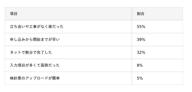- 乗り換え手続きの利便性が高く、55%が「立ち会いや工事がなく楽だった」、32%が「ネットで数分で完了した」と回答。インフラの切り替えに伴う心理的・時間的ハードルが低いことが、スムーズな契約を後押ししているようだ。