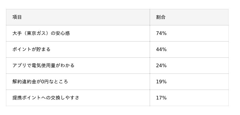 - 利用者の74%が「大手(東京ガス)の安心感」をメリットとして挙げており、信頼性が契約の決め手と判明。実際に合計で64%の人が「満足」以上の評価を選択している。