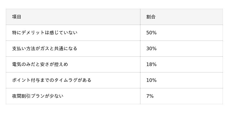 - 家計への影響については、39%が「支払額はあまり変わらない」とした一方で、34%が「ポイントやセット割で総合的にお得」と回答。直接的な電気代の値下げだけでなく、ガスとの合算支払いやポイント還元を含めたトータルでの使いやすさとお得感が支持されている。