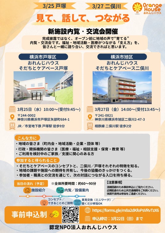 認定NPO法人おれんじハウス(横浜市、理事長:中陳亮太)は横浜市内に新たに開設する保育・医療・発達支援を一体化した総合支援拠点『おれんじハウス そだちとケアベース 戸塚』『おれんじハウス そだちとケアベース 二俣川』(いずれも2026年4月1日開業)の内覧・交流会を2026年3月25日(水)・27日(金)に開催します。