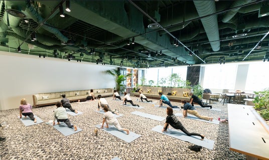 【神谷町Morning Yoga】 始業前の朝の時間帯に、当社本社オフィスのエントランス空間「ロビー」を開放し、季節のテーマに合わせたリフレッシュヨガプログラムを提供しています。2024年6月の初開催以降、これまでに21回、延べ約360名のワーカーの皆様にご参加いただきました。