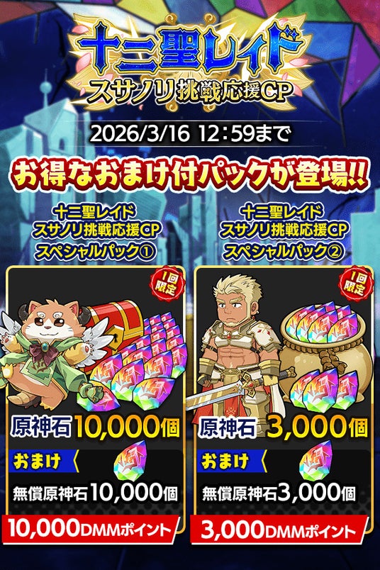 原神石のおまけが大量入手可能でおトクな「十二聖レイド スサノリ挑戦応援キャンペーンスペシャルパック」が2種登場! さらに冒険に役立つ様々なアイテムが選べる「十二聖レイド スサノリ挑戦応援キャンペーンセレクトパック」も3種登場! 選べるアイテムはセレクトパックの種類によって異なるので要チェック!