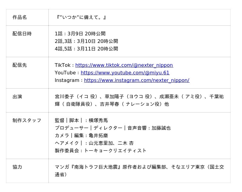 ネクスター株式会社(本社:東京都新宿区、代表取締役CEO:細田 悠巨)グループの「TOKYO creatist」は、震災から15年目の節目に向けて、若年層の防災意識をアップデートする縦型ショートドラマ『『”いつか”に備えて。』を公開開始いたします。本作は、マンガ『南海トラフ巨大地震』(講談社)の原作者および編集部許諾のもと、同作を公式に引用。国土交通省が運営する「そなエリア東京」をロケ地に、発災直後のリアルな生存戦略を描いた啓発ドラマです。