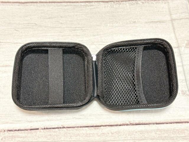 開閉はファスナー仕様。内側にはメッシュポケットとゴムバンド付きで、ケーブルやイヤホンなどをしっかり固定して収納できます。