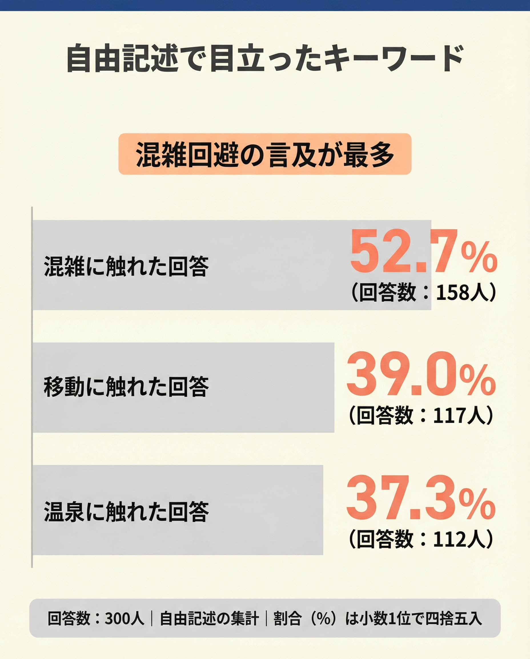 また、移動に触れた回答は39.0%(117人)、温泉に触れた回答は37.3%(112人)でした。